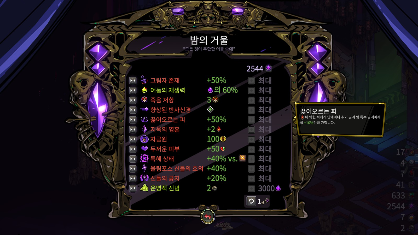 어둠을 모아서 어둠의 거울을 강화 → 대쉬 1회 추가, 부활, 더 높은 은혜가 등장할 확률 증가